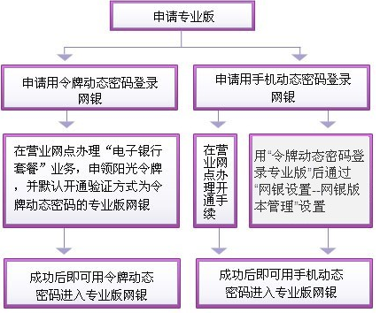 • 如果您已是光大银行网上银行专业版的客户,在成功“用令牌动态密码登录专业版”后通过“网银设置——网银版本管理”业务,自助开通安全验证方式为手机动态密码的专业版,成功开通后,您就可以用登录名或已加挂网上银行的卡(账)号和网上银行登录密码“用手机动态密码登录专业版”,享用光大银行企业家网上银行的全部金融服务。