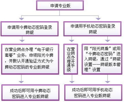 • 如果您已是光大银行网上银行专业版的客户,在成功“用阳光网盾登录专业版”或“用令牌动态密码登录专业版”后通过“网银设置——网银版本管理”业务,自助开通安全验证方式为手机动态密码的专业版,成功开通后,您就可以用登录名或已加挂网上银行的卡(账)号和网上银行登录密码“用手机动态密码登录专业版”,享用光大银行网上银行的全部金融服务。